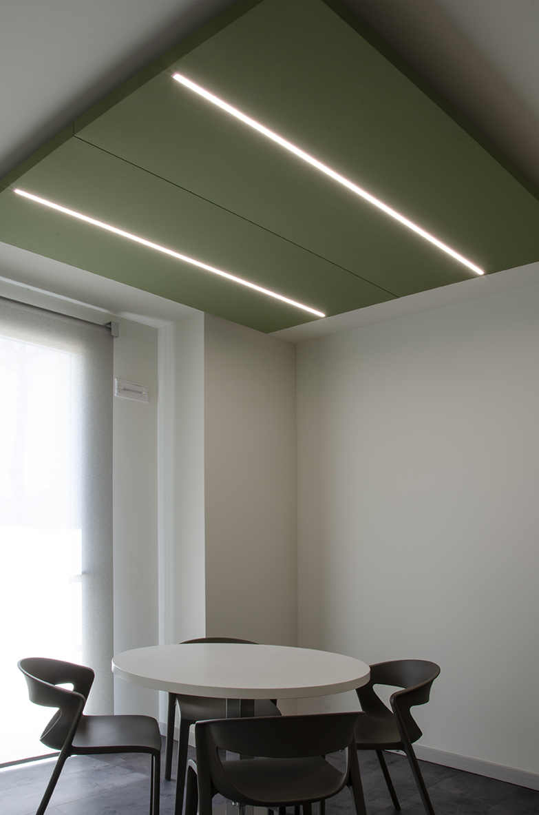Questa soluzione permette di progettare fin da subito interventi di ristrutturazione o nuovi allestimenti che integrano comfort acustico e illuminotecnico in un unico sistema.