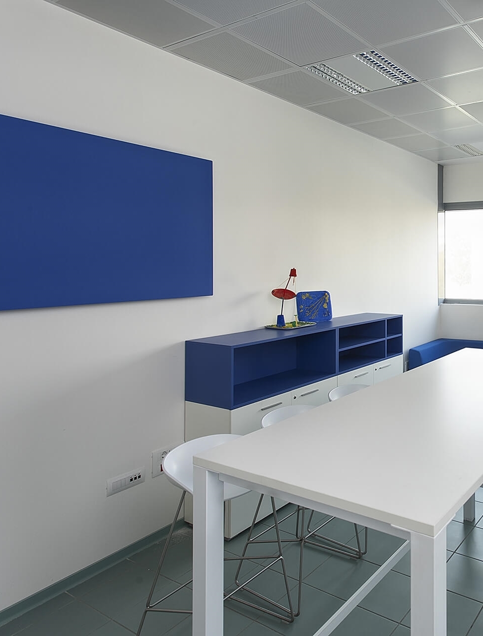 • Quadri fonoassorbenti: possono essere posizionati dietro le scrivanie o lungo le pareti principali per unire efficacia acustica ed estetica, soprattutto in spazi rappresentativi o di accoglienza.